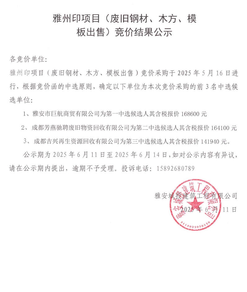 雅州印項目(廢舊鋼材、木方、模版出售)競價結果公示